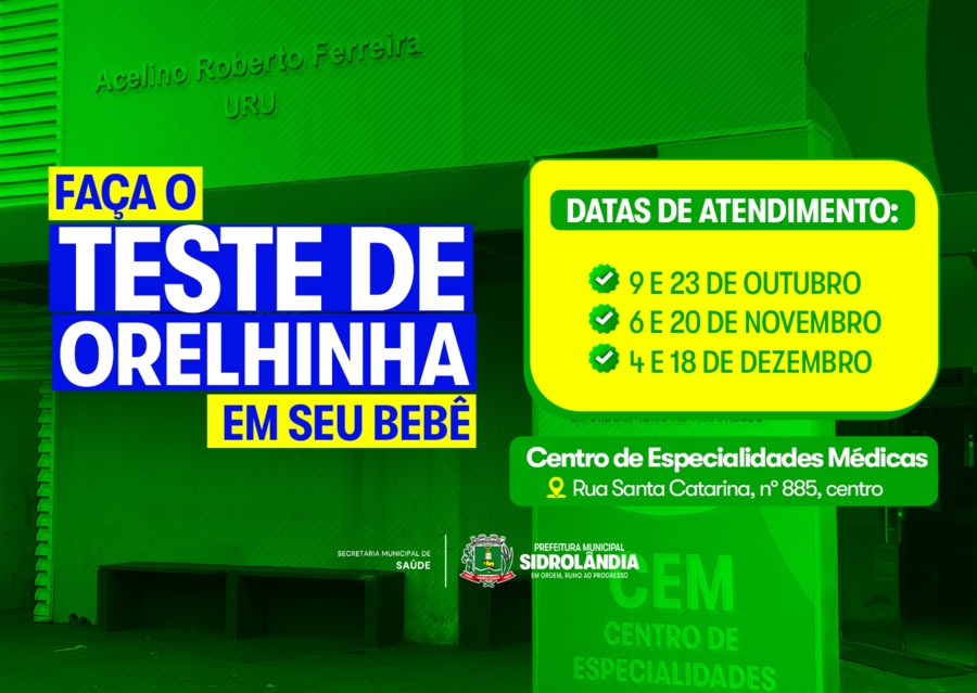 A Prefeitura de Sidrolândia, por meio da Secretaria Municipal de Saúde, informa o cronograma do Teste da Orelhinha, exame fundamental para detectar precocemente p...